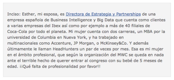Francisco Hernández Marcos y Esther Yuste acudieron por motivos laborales al Mobile World Congress (MWC). Lo hacían con su hija Marina, de cinco meses, pero no pudieron acceder al recinto de la Fira de Barcelona al encontrarse con un menor. Poco importó que la niña estuviera en edad lactante, Francisco fue expulsado del recinto "con malos modos" y su esposa acusada de "poco profesional", denuncia ahora él mismo desde las redes sociales y su blog, cuyo post se ha compartido hasta el momento 18.000 veces en Facebook.
