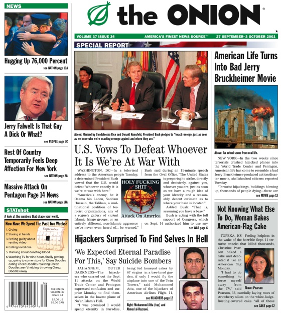 Uno de los ejemplos más citados son los artículos que publicó The Onion tras el 11S. Este diario satírico estadounidense que ha inspirado webs como El Mundo Today “no bromeó sobre los aviones impactando en las torres o acerca de los ciudadanos que murieron ese día”, explican Peter McGraw y Joel Warner en The Humor Code. Lo que hicieron fue presentar a los terroristas como idiotas, con titulares como "Los terroristas se sorprenden al encontrarse en el infierno" y "Dios, furibundo, aclara el mandamiento de ‘no matarás’".