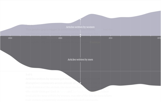 El resultado es muy claro: “De los 10 escritores que sufren más acoso, ocho fueron mujeres (cuatro blancas y cuatro no-blancas) y dos, hombres negros. Dos de las mujeres y uno de los hombres fueron homosexuales. Y de las ocho mujeres en el top 10, una era musulmana y otra judía”, dice el artículo. También explica que se bloquean más comentarios en los textos escritos por mujeres y que, aunque el número de artículos de autoras ha aumentado en los últimos años, la brecha de género se mantiene, porque también lo han hecho los publicados por hombres. Además, la única sección del periódico en la que hay más artículos firmados por mujeres es Estilo.