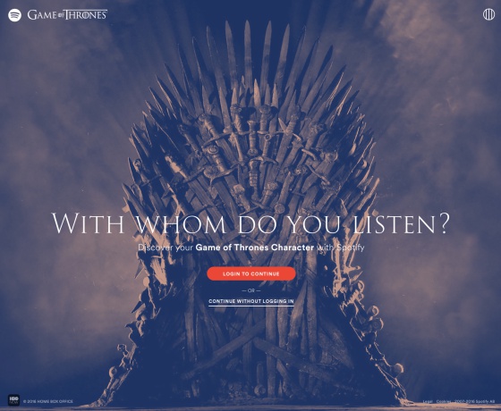 Si se tiene una cuenta en Spotify, el servicio coteja los gustos del usuario en función de sus últimas escuchas Con el personaje resultante, aparece una lista musical especializada inspirada en él, para compartir en redes sociales. Daenerys Targaryen es una mezcla de pop, trance progresivo y rock y Jamie Lanister es una combinación entre EDM, eurodance y pop rock.
