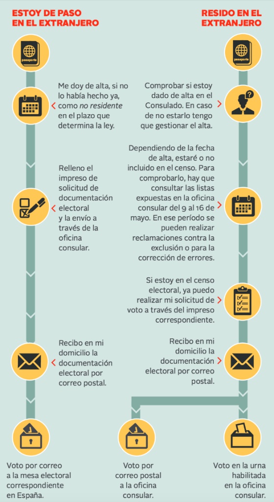 El sistema para votar desde el extranjero depende de la situación administrativa del migrante: si ha comunicado al Consulado que está viviendo en el país en cuestión y si al hacerlo lo ha hecho como residente temporal o como residente permanente. El Ministerio de Exteriores resume los pasos a seguir en este diagrama, que no incluye a los no registrados: