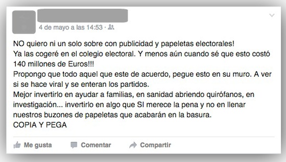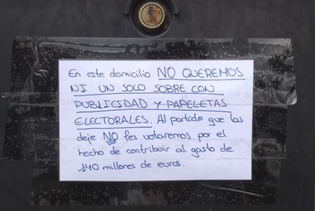 Además de este mensaje copiado y compartido directamente en los muros de Facebook, en las últimas horas se ha popularizado una fotografía de un cartel pegado en la puerta de una casa que pide, expresamente, que no dejen "ni un solo sobre de publicidad y papeletas electorales. Al partido que las deje", dicen, "NO le votaremos por el hecho de contribuir al gasto de 140 millones de euros". Una petición que han difundido desde esta cuenta de Facebook 1.800 personas en tres días.