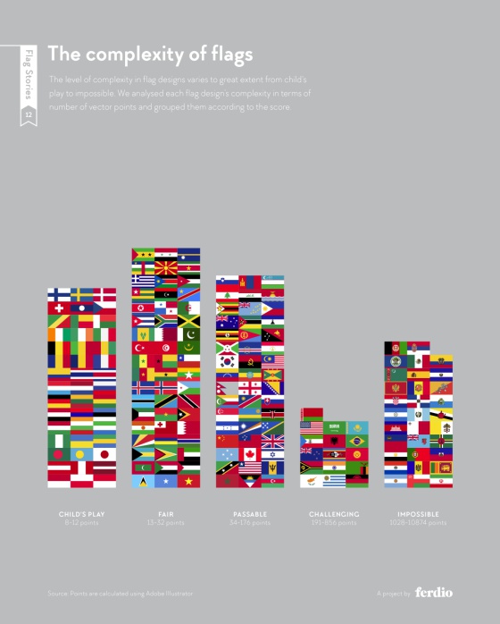 Las infografías, que Ferdio ha concebido para que sean compartidas en redes sociales, muestran en el pequeño recinto de una bandera, a través del diseño, "historias complejas sobre la cultura, la historia y el sentir de un grupo de personas de un modo sencillo", explica el equipo detrás de Flag Stories.