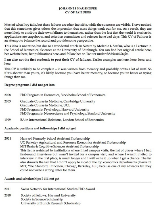En el currículum, Haushofer habla sobre los altibajos de su carrera profesional, los títulos que no consiguió, los puestos de trabajo académicos para los que no fue seleccionado o las becas que solicitó y no obtuvo. “El mundo es un lugar relativo, las peticiones que hacemos son imprevisibles y los comités de selección o los jueces tienen días malos. Este CV de fracasos es un intento de equilibrar mis registros y proporcionar cierta perspectiva", explica en la publicación.