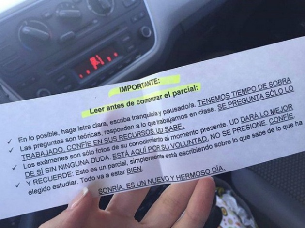 1. Compartir un mensaje positivo antes de comenzar un examen. “Confíe en sus recursos, usted sabe”, se lee en un pequeño papel que la profesora argentina Andrea Tirra, de la Universidad Nacional Arturo Jauretche, anexó a un examen. “Los seres humanos necesitamos aliento toda la vida. Crecemos a partir del refuerzo positivo de las acciones que vamos a realizar, una palabra nunca está de más”, declaró en entrevista para la radio de la Universidad en donde labora, en Buenos Aires. Tirra, también psicóloga, dijo en esa entrevista que atiende muchos casos de crisis de angustia relacionados a la anticipación de responder un examen. Por esta razón decidió engrapar su mensaje en el parcial e inspirar confianza en sus estudiantes.