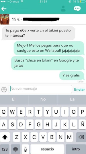 Wallapop es una aplicación que acerca al teléfono móvil el mercado de productos de segunda mano. Tantas son sus posibilidades, que en su amplia oferta y demanda se cobijan intentos de timo, ligones incansables y bastantes patadas al diccionario. Desde el pasado verano, una versión paródica llamada Wallapuff selecciona los anuncios reales más surrealistas que se encuentran en este servicio. Sus 90.000 seguidores en Facebook hacen que sea casi tan exitosa como la cuenta original, de la que solo le separan 15.000 personas.