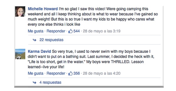 "¡Me alegro mucho de haber visto este vídeo!", explica una mujer en la sección de comentarios, "Voy de acampada este fin de semana y solo puedo pensar en qué me voy a poner porque he engordado bastante. Pero tiene razón, quiero que mis hijos sean felices. A quién le importa lo que piensen otros de mi aspecto". Otras madres reconocen haber dejado de hacer alguna actividad para evitar mostrar su cuerpo: "Muy cierto, solía no nadar nunca con mis hijos porque no quería ponerme en traje de baño. El verano pasado, decidí mandarlo a la mierda: 'La vida es demasiado corta, métete en el agua". Mis hijos estaban encantados. Lección aprendida ¡Vive tu vida!".