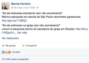 Tras la violación colectiva de una joven brasileña el pasado mayo, han sido muchas las reacciones de rechazo a la situación tanto en las calles de diferentes ciudades latinoamericanas como en las redes. Una de las últimas en volverse viral llega desde Argentina: la publicación de la porteña Zuleika Esnal, que pretende poner de manifiesto la cultura de la violación y la culpabilización a la víctima, ha superado los 34.000 compartidos en Facebook en menos de una semana.