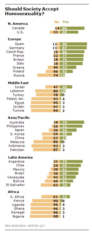 El centro de análisis hablaba de “amplia aceptación de la homosexualidad en Norteamérica, la Unión Europea y Latinoamérica”, pero su estudio también mostraba el rechazo que se daba “en los países predominantemente musulmanes y en África, así como en partes de Asia y en Rusia”.