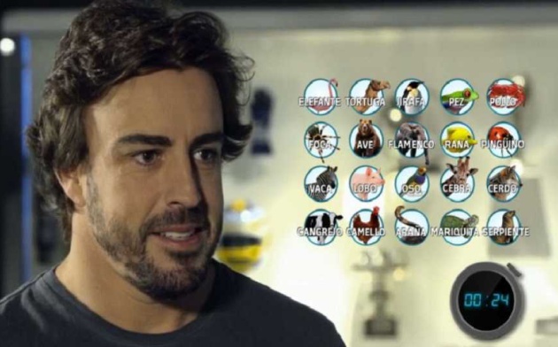 En la primera prueba del programa, Lobato mostró el dibujo y el nombre de varios animales. El piloto de McLaren tenía que nombrar todos los que podía en 15 segundos. La cosa se complicó cuando el siguiente cartel le mostró los nombres de estos animales, pero asociados a otras imágenes. Es decir, la palabra “elefante” estaba impresa sobre la fotografía de un flamenco y “tortuga” sobre un camello, por ejemplo. La tarea era más difícil debido a la incongruencia entre el texto y la imagen.