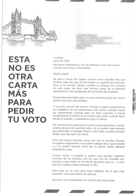 Ni Pablo Iglesias ni Alberto Garzón firman la carta que estos días ha comenzado a llegar a los buzones españoles junto a las papeletas de Unidos Podemos para pedir el voto. Lo hace Esperanza, una joven española de 30 años que estudió Biología Molecular y tuvo que emigrar a Londres para encontrar trabajo. Es una carta a sus padres, para darles las gracias por todos los esfuerzos que han hecho por ella. Echa de menos España y quiere volver. Sin embargo, Esperanza no existe. O, al menos, no es una persona concreta, sino un personaje al que han recurrido en el partido para dirigirse a los votantes.