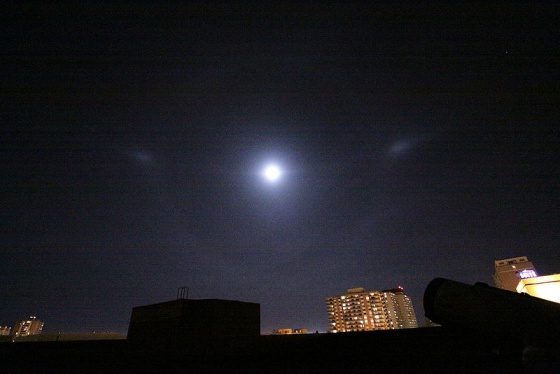 Paraselene. Fenómeno luminoso por el que se forman una o varias imágenes de la Luna reflejadas en las nubes y, por lo general, dispuestas simétricamente sobre un halo.