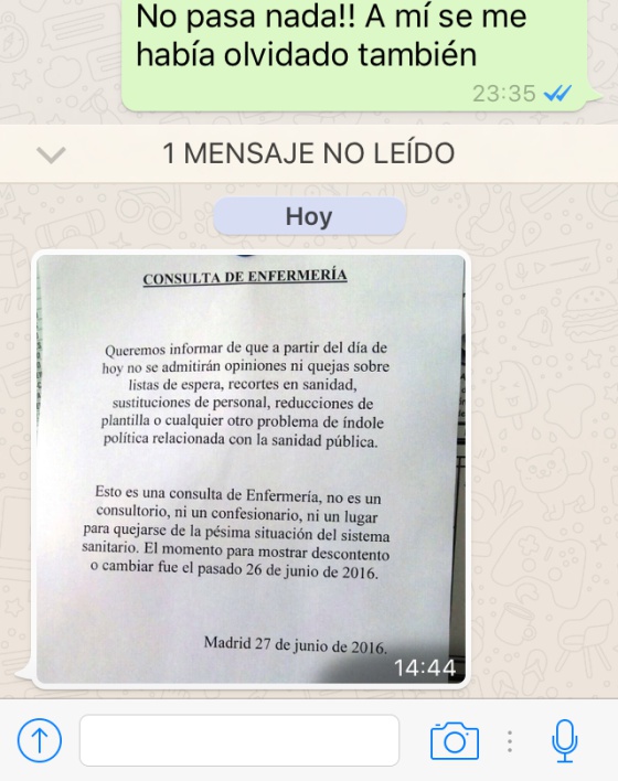 El letrero, que tiene fecha del 27 de junio, supuestamente está colgado en una consulta de enfermería, pero es imposible encontrar su origen. En él, se pide que los pacientes que no se quejen ni por las listas de espera, recortes en sanidad, reducciones de plantilla, etc., porque "el momento para mostrar descontento o cambiar fue el pasado 26 de junio de 2016".