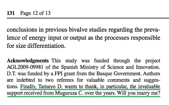 Cuando uno quiere pedir matrimonio a su pareja suele tirar de imaginación. Algunos lo hacen en lugares espectaculares, otros en público mientras están de servicio y hay quien se declara en un artículo científico sobre mejillones. Es el caso del biólogo vasco David Tamayo, que incluyó su petición en los agradecimientos de una publicación que realizó para la revista Marine Biology -especializada en investigaciones del ecosistema marino-.