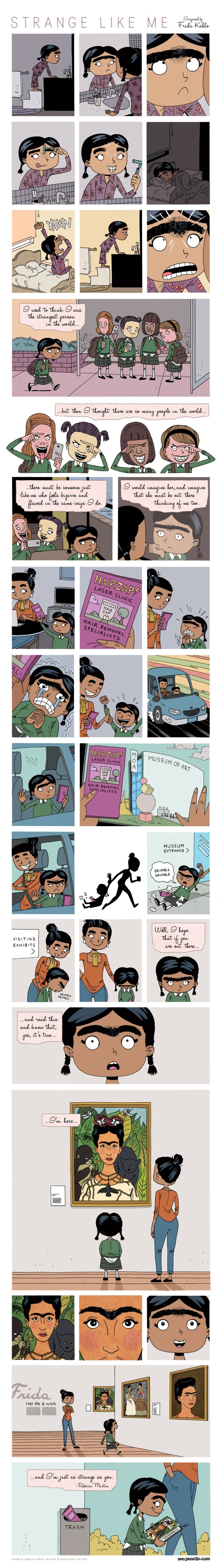 La caricatura del australiano cuenta la historia de una niña que tiene cejas pobladas. Por esta característica se burlan de ella en la escuela, por lo que la niña pide a su madre que la lleve a una clínica para depilarse con láser. En vez de cumplir su deseo, la madre la lleva al Museo de Arte a ver el trabajo de Frida Kahlo. Es ahí cuando la protagonista se da cuenta de que no es la única con cejas distintas y que, personas como Kahlo, hacen de estas peculiaridades físicas algo especial. Puedes ver la tira al final del artículo.