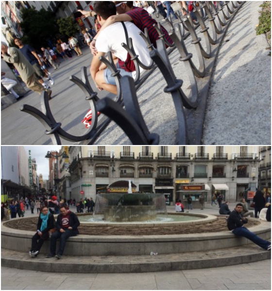 En 2014, el COAM hizo un experimento: puso en un banco en la Puerta del Sol para reconocer la reacción de los ciudadanos. Era parte de un proyecto más amplio orientado a repensar la plaza que alberga el kilómetro cero y recuperarla para los ciudadanos. Piensa Sol se quedó en un experimento pero aquellos que probaron el primer banco en 30 años en el corazón de Madrid lo agradecieron. El pasado abril, Madrid eliminó los pinchos que rodeaban la fuente que se encuentra en el centro de Sol y que impedían sentarse cómodamente a su alrededor. Hace un par de semanas, también anunciaron que instalarían dos fuentes públicas en la plaza