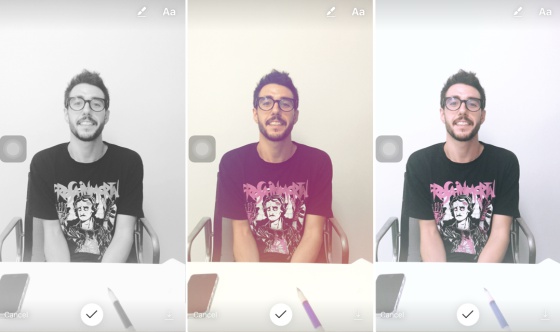 Snapchat tiene un rotulador al que se le puede cambiar el color cuando se mueve el dedo por la franja colorida a la derecha de la pantalla o cuando se mueve el dedo por toda la pantalla. Instagram tiene tres rotuladores: el básico, un resaltador (diseñado específicamente para resaltar el texto blanco, tiene un tinte transparente) y uno que imita a los letreros neón de los 80.