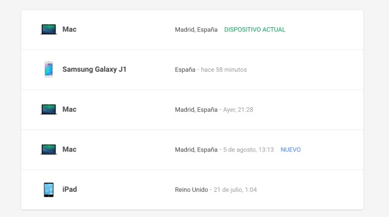 Google te ofrece la posibilidad de almacenar "contactos, calendarios, alarmas, aplicaciones, música, películas, libros y otros contenidos". También el estado de tus dispositivos, incluyendo datos como "si la pantalla está encendida" y "el nivel de batería". Te sorprenderá ver a todos tus gadgets bien ordenaditos por fecha y lugar de conexión.