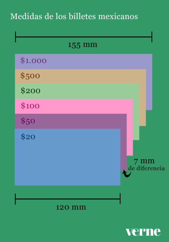 El tamaño del billete es otra forma de diferenciarlo. La siguiente ilustración muestra las medidas de todos. Hay siete milímetros de diferencia entre una denominación y la siguiente.