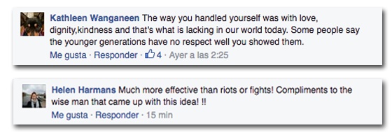 Aunque ha recibido algunas respuestas negativas -aludiendo a la libertad de expresión y el derecho a mantener fuera del escrutinio público conversaciones que se producen en privado- el comportamiento del joven ha sido, en general, muy aplaudido en las redes sociales. "El modo en que te defendiste, con amor, dignidad y amabilidad, es lo que falta en el mundo de hoy", escribía un usuario en Facebook. "¡Mucho más efectivo que los disturbios o las peleas! ¡Enhorabuena al sabio chico al que se le ocurrió esta idea!", recogía otros de los comentarios.