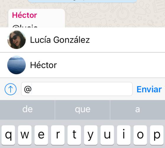 Con solo teclear la @, la aplicación da a escoger entre los usuarios del grupo. Y da igual con qué nombre tengamos guardado su número: cada integrante lo verá con el que tenga en su agenda y nosotros, con nuestro nombre de usuario. Por ejemplo, si Lucía hace una mención a Jaime y lo tiene guardado como "El feo de Verne", ni Jaime ni el resto del grupo verá este mote.