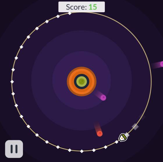 Space Orbit. Estamos en órbita a un planeta que, por algún motivo, nos lanza proyectiles de colores. Hay que moverse adelante y atrás para ir esquivándolos. Me ha parecido difícil y divertido, además de pacífico: algo o alguien nos está tirando cosas y nosotros simplemente las esquivamos, sin vengarnos ni exterminar a los habitantes de ese planeta, por mucho que se lo merezcan por desagradables.