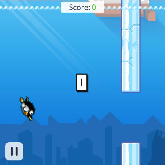Skipper. Un pingüino esquiva icebergs. El pingüino se mueve siempre hacia la derecha y con un solo botón le damos impulso hacia arriba, como en Spiky Fish. No pasé del primer iceberg.