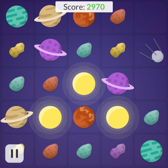Meteoric Plus. Otro juego peligroso: parecido al 2048, pero con asteroides, satélites, planetas y estrellas. Hay que ir uniendo cuerpos planetarios de la misma forma y color. Cuando unimos dos o más soles, explotan, cargándose todo lo que hay alrededor. (Nota: no sé mucho de astronomía, pero creo que no funciona del todo así en la vida real).