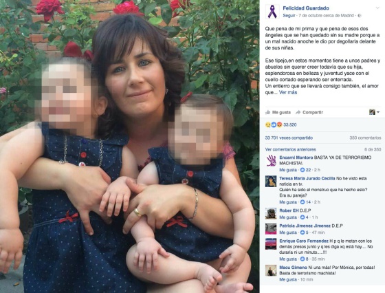 En ese contexto, Felicidad Guardado -que se identifica como prima de la víctima-, compartía a las pocas horas del suceso una reflexión en su perfil de Facebook sobre el daño tan profundo que estos asesinatos causan en las familias que lo sufren. Un texto, en el que también hace referencia a las penas que se aplican a los agresores, que ha sido compartido desde entonces por más de 33.000 personas. El post se acompaña de una foto de la fallecida con sus dos hijas en brazos.