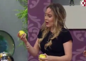 Angel: Ella es Belinda, como saben en América Latina ella es la más grande estrella pop y estará en mi show de TV y me pidió que hiciera un truco con una manzana. Entonces voy a intentar usar mi mente para partir esta manzana en dos. Pero antes, puedes revisar que esta es una manzana común y corriente.