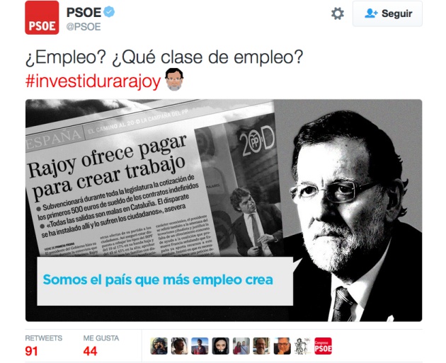 Mientras Mariano Rajoy hablaba en el debate de investidura, el 26 de octubre, muchos partidos se encontraban tuiteando: lo hacía el propio PP, Izquierda Unida, Ciudadanos... y, por supuesto, también el PSOE. Desde su cuenta, los socialistas han puesto en marcha una estrategia en la que discutían y rebatían con titulares de periódico algunas afirmaciones del presidente del gobierno en funciones, lo que ha descolocado a los tuiteros: ¿pero están a favor o en contra? ¿No se supone que van a abstenerse para que gobierne precisamente Rajoy?