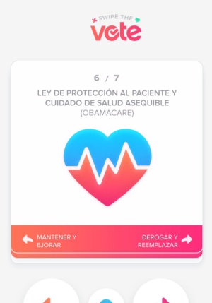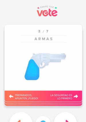 La encuesta aparece en la interfaz de Tinder con el lema "Swipe the vote" ("Desplaza el voto") y el mismo formato de tarjetón con el que aparecen los anuncios en la aplicación. Al hacer clic, la app redirige a un micrositio con un funcionamiento idéntico al de Tinder: aparecen tarjetas con temas de política y, como si se tratase de perfiles, el usuario debe desplazarlas a izquierda o derecha dependiendo de si está de acuerdo o no. Algunos de los temas que aparecen son: