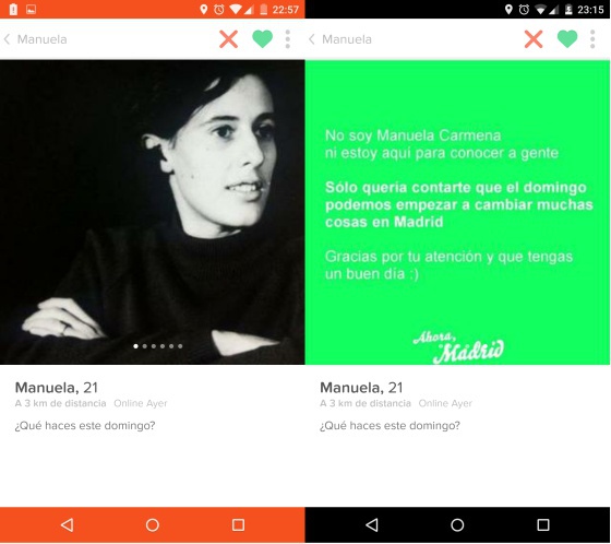 Tinder también ha sido utilizado como herramienta política en España, aunque no de forma oficial. Antes de las elecciones municipales de mayo de 2015, un perfil de la ahora alcaldesa de Madrid, Manuela Carmena, apareció en la aplicación. En una de sus fotos podía leerse: "No soy Manuela Carmena ni estoy aquí para conocer a gente. Sólo quería contarte que el domingo podemos empezar a cambiar muchas cosas en Madrid. Gracias por tu atención y que tengas un buen día". Fue creado por el Movimiento de Liberación Gráfica de Madrid.