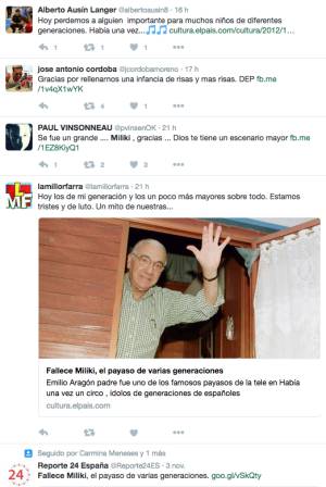 El tema también llegó a Twitter: la mañana del viernes aún había gente compartiendo el artículo de EL PAÍS. Eso sí, en esta ocasión, Miliki no se colocó entre las tendencias, según Trendinalia, web que recoge los temas más comentados en esta red social.