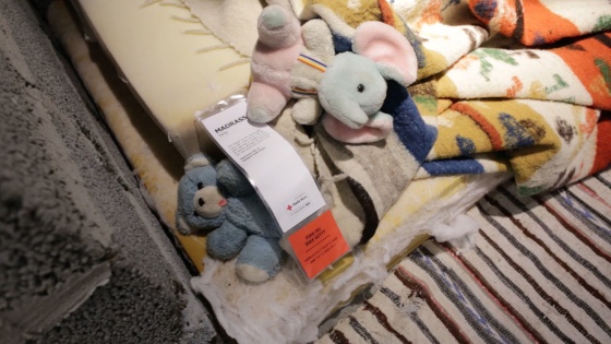 Mollekleiv tomó las fotos de la casa que sirvieron a los diseñadores para recrearla. En la exposición se encuentran los bidones vacíos de agua y en vez de lámparas están los cuadros explicativos con la historia de la familia. Todo reconstruido al milímetro. Solo que en las etiquetas de las mantas y los juguetes no ponen precio, sino el número de cuenta de la Cruz Roja para hacer el donativo.