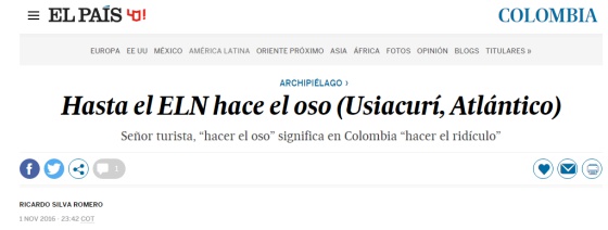Oso. Como escribió el escritor colombiano Ricardo Silva en una de sus columnas en EL PAÍS: “Señor turista, 'hacer el oso significa' en Colombia 'hacer el ridículo'”. Entre otros ejemplos, Silva usaba la frase de un líder de la guerrilla del ELN para explicar esta expresión. “Hizo el oso con sevicia el jefe del equipo negociador, Pablo Beltrán, cuando les contestó: ‘Nosotros cobramos impuestos como el Gobierno”. La insurgencia que niega ser parte del Estado, aunque actúa como tal y sin repartir. “¿Para qué?”, plantea el escritor.