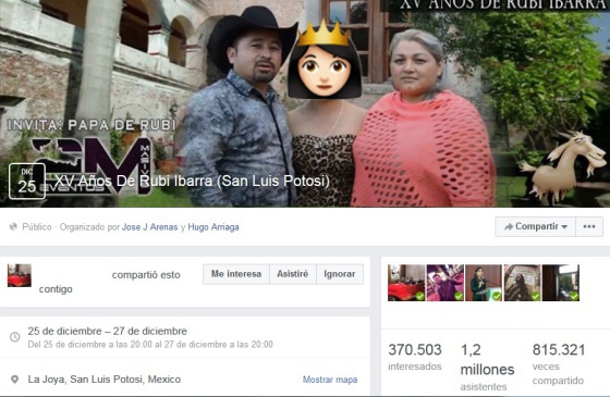 Ahora mismo en México está siendo la comidilla de todo el mundo la fiesta de quinceañera de una adolescente llamada Rubí: la invitación en vídeo viralizó y en el evento en Facebook ya se han apuntado como asistentes 1,3 millones de personas. Tal es el éxito que el gobernador del Estado de México ha invitado a la quinceañera a un fin de semana en una zona de vacaciones de ese Estado, con la aerolínea Interjet encantadísima de pagarle el vuelo y con Maybelline deseando maquillarla para ese día. Incluso Spotify México ha preparado una playlist para calentar motores hasta que llegue el día de la fiesta. No te miento si te digo que todo este evento me tiene emocionada. Ojalá pudiera ir.