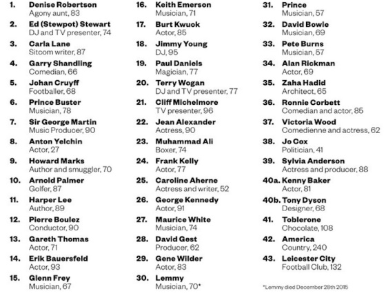 Johan Cruyff (en la línea del fondo), el actor Alan Rickman (en el centro-derecha), Prince (en primera fila)... todos ellos fallecieron durante este año y aparecían en la imagen original, que logró casi 2.000 "me gusta". También se incluía lo que Barker considera una fatalidad, como el Brexit, el asesinato de la diputada laborista Jo Cox o la gorra de Donald Trump con el lema "Make America great again" (Haz EE UU grande de nuevo). Todas ellas se pueden en primer plano, como el disminuido Toblerone, otra mala noticia para la sociedad británica.
