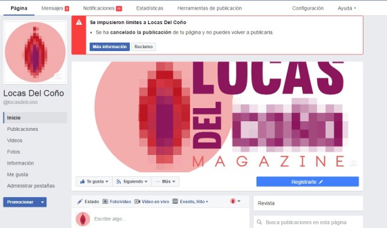 Locas del Coño es una revista feminista digital española. El miércoles 21 de diciembre, Facebook cerró su página en la red social, con más de 150.000 seguidores. Hasta cuatro veces ha llegado a estar suspendida la página en una semana: la última, este martes 27 de diciembre, según explica una de sus fundadoras, Lidia Infante. Seis días después de que Verne le consultara, Facebook responde que se ha tratado de un error y pide disculpas.