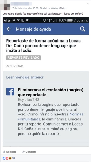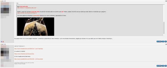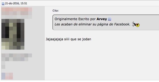 Lo que sí se encuentra en el foro son conversaciones posteriores al cierre en las que se celebra y se anima a "reportar" las nuevas páginas para conseguir tumbarlas. Estos son algunos de los post -se pueden ampliar las imágenes pulsándo en ellas- en los informan en el foro del cierre de la página feminista. En uno de ellos se muestra un pantallazo de la respuesta de Facebook a una denuncia realizada sobre Locas del Coño.