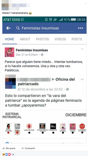 En Facebook hay varios grupos, entre ellos Oficina del Patriarcado, donde también hay usuarios -muchos procedentes de países como México- que comparten su participación en las campañas de denuncias masivas. Este miércoles, un usuario se reía de un grupo feminista que relaciona los ataques con el miedo al feminismo y la igualdad de las mujeres. Feministas insumisas había compartido el pantallazo de un supuesto plan difundido en otro grupo, La gruesa vara del patriarca, para "tumbar" en diciembre varias páginas de Facebook entre las que se encontraba Locas del Coño.