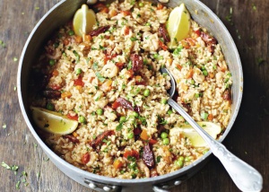 La "paella al horno" de Schneider ni podría llamarse arroz con cosas, en todo caso, cosas con arroz, ya que la cantidad de este cereal es ínfima comparada con la de langosta. Además, la receta del actor hace un guiño a la de Jamie Oliver: en la parte inferior derecha pueden verse un par de rodajas de chorizo.