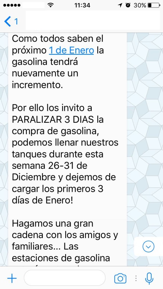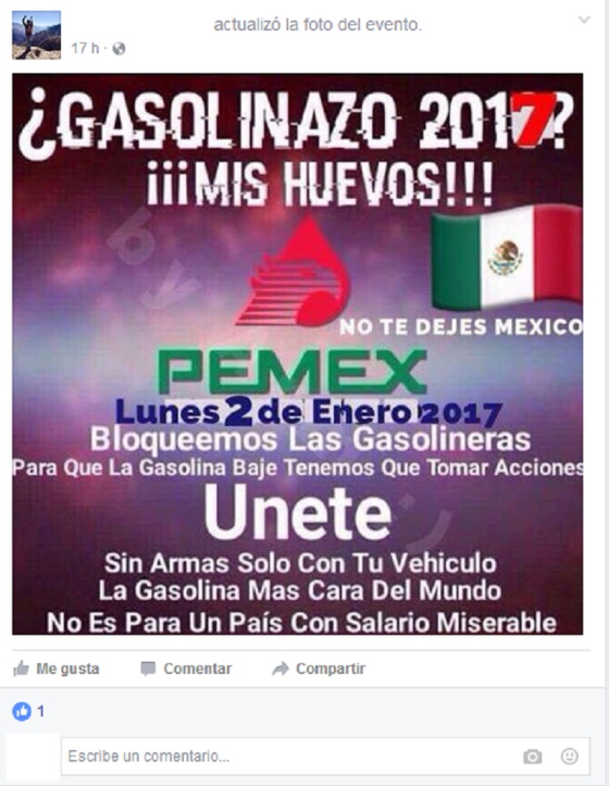 También en Facebook ha circulado este mensaje que invita a los mexicanos a bloquear las gasolineras con sus autos el próximo lunes 2 de enero. “Para que la gasolina baje debemos tomar acciones”, se lee en la publicación. Por lo menos cuatro eventos se han creado para realizar esta protesta, uno de ellos registra más de 6.000 compartidos en un día.