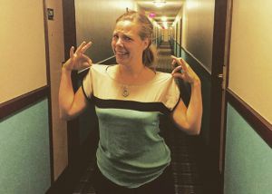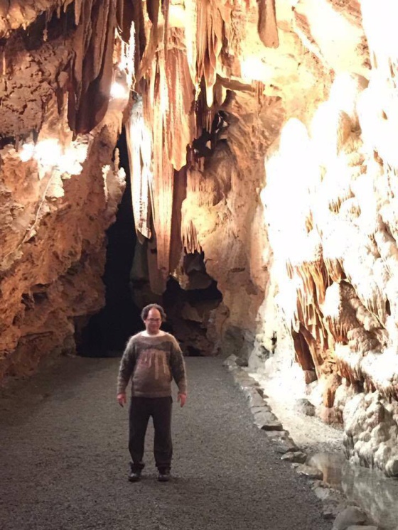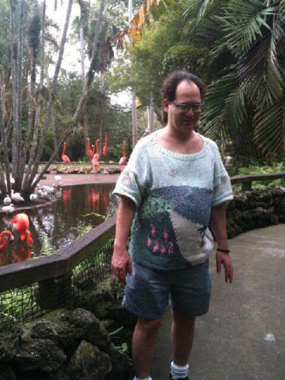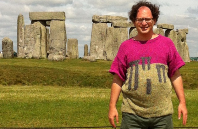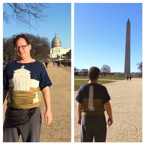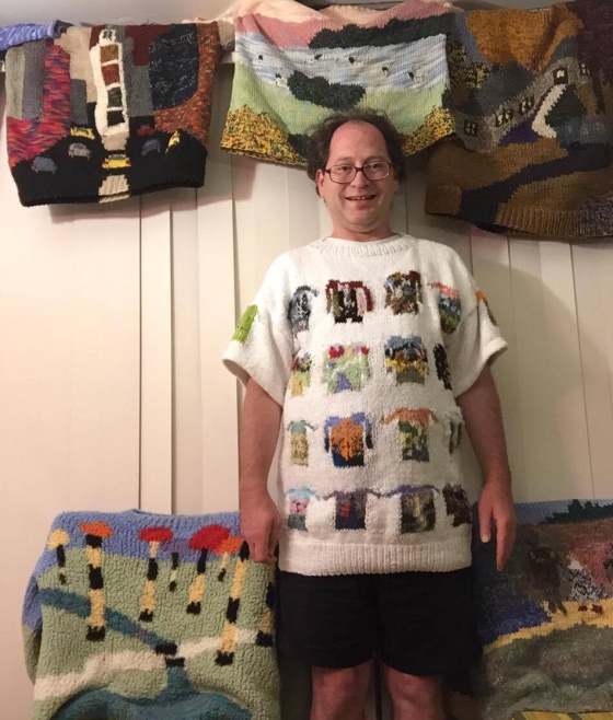 This guy makes sweaters of places and then takes pictures of himself wearing the sweaters at those places.