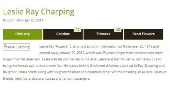 La necrológica explicaba que "Leslie Ray Popeye Charping nació en Galveston el 20 de noviembre de 1942 y falleció el 30 de enero de 2017, 29 años más tarde de lo esperado y mucho más tarde de lo que merecía". Según el texto, su muerte "deja a dos hijos aliviados: su hijo Leslie Roy Charping y su hija Sheila Smith, además de seis nietos y muchas otras víctimas, incluyendo una exesposa, familiares, amigos, vecinos, médicos, enfermeras y extraños".