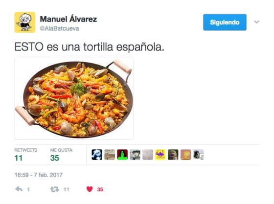 Para entenderlo hace falta estar al corriente de las polémicas sobre la paella (la más reciente, con Jamie Oliver) y de cómo este tema solivianta a los valencianos y provoca, a partes iguales, la ira y la burla de los tuiteros. También ayuda conocer (y haber participado) en las airadas discusiones en esta red social sobre si la tortilla ha de ser con o sin cebolla. Este último debate es absurdo, por supuesto: sin cebolla.