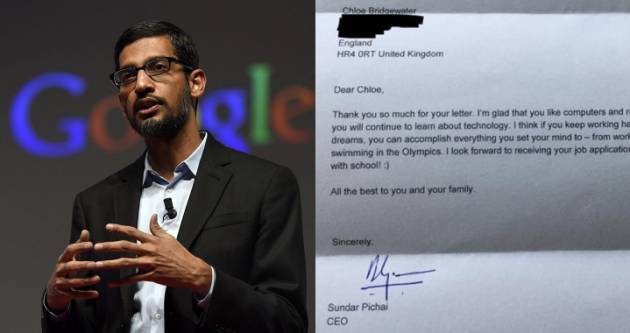El padre envió la carta a las oficinas de Google en California. La historia se podría haber quedado ahí, pero el receptor de la misiva no ignoró a Chloe. Esta es la respuesta del director general de Google a la niña británica, que su padre compartió en Linkedin -donde acumula 261.000 me gusta y 6.5000 comentarios- y en Twitter. Este es el tuit y debajo puedes leer la traducción en español.