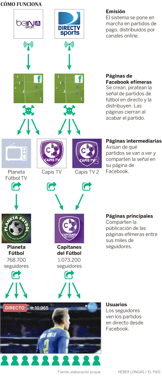 Este entramado de páginas consigue burlar las normas de funcionamiento de la plataforma con un sistema perfectamente pensado para ello. Por un lado existen páginas con cientos de miles de seguidores que alimentan una comunidad, como Planeta Fútbol o Capitanes del Fútbol. Estas páginas comparten las emisiones en directo de otros perfiles temporales, que a veces cierran cuando acaba un partido. Eso hace que sea más difícil rastrear las páginas que pinchan la emisión. Por su parte, las páginas principales, aquellas que tienen una comunidad muy amplia, evitan que les puedan cerrar el perfil puesto que ellos no hacen más que compartir la emisión pirata.
