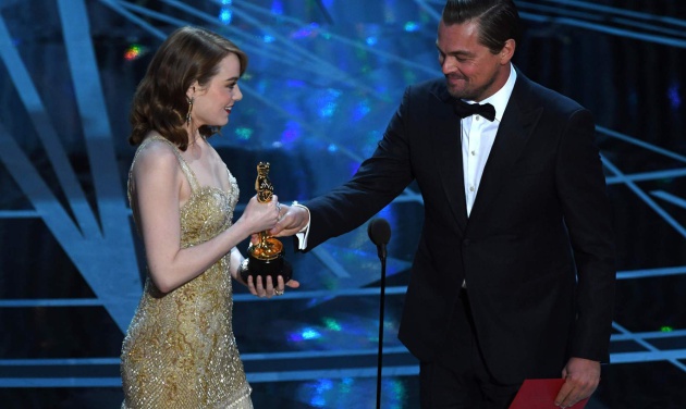 Por si sigues creyéndotelo, en las fotografías que se hicieron DiCaprio y Stone al salir del escenario se les puede ver muy contentos... y con el sobre.