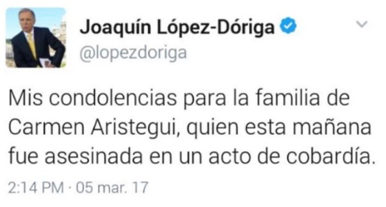 Desde el pasado domingo, numerosos medios en México publicaron la imagen de un supuesto tuit de la cuenta del periodista Joaquín López-Dóriga anunciando el asesinato de Carmen Aristegui. “Mis condolencias para la familia de Carmen Aristegui, quien esta mañana fue asesinada en un acto de cobardía”, se lee en el mensaje que también fue compartido en Twitter, pero como un pantallazo, no fue retuiteado directamente de la cuenta. Uno de los medios aseguraba que el presentador había borrado el tuit después de percatarse del error.